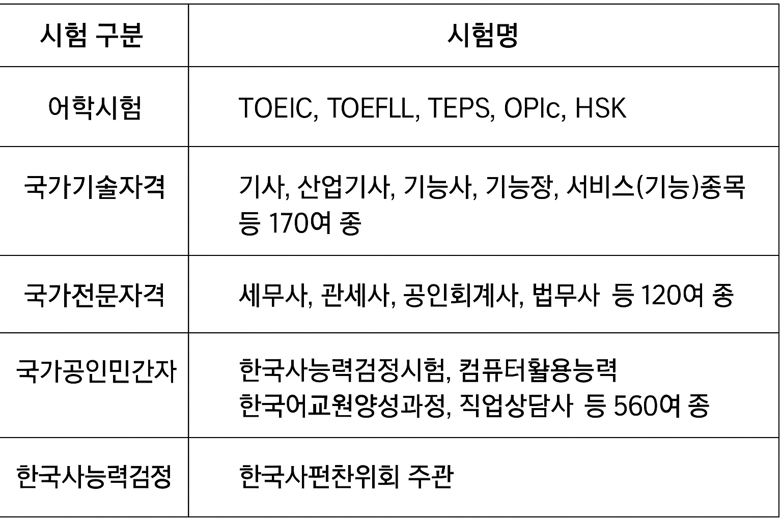 - 시험 종류: 총 1,004종 (어학시험, 국가기술자격, 국가전문자격, 민간자격, 한국사능력시험 등)