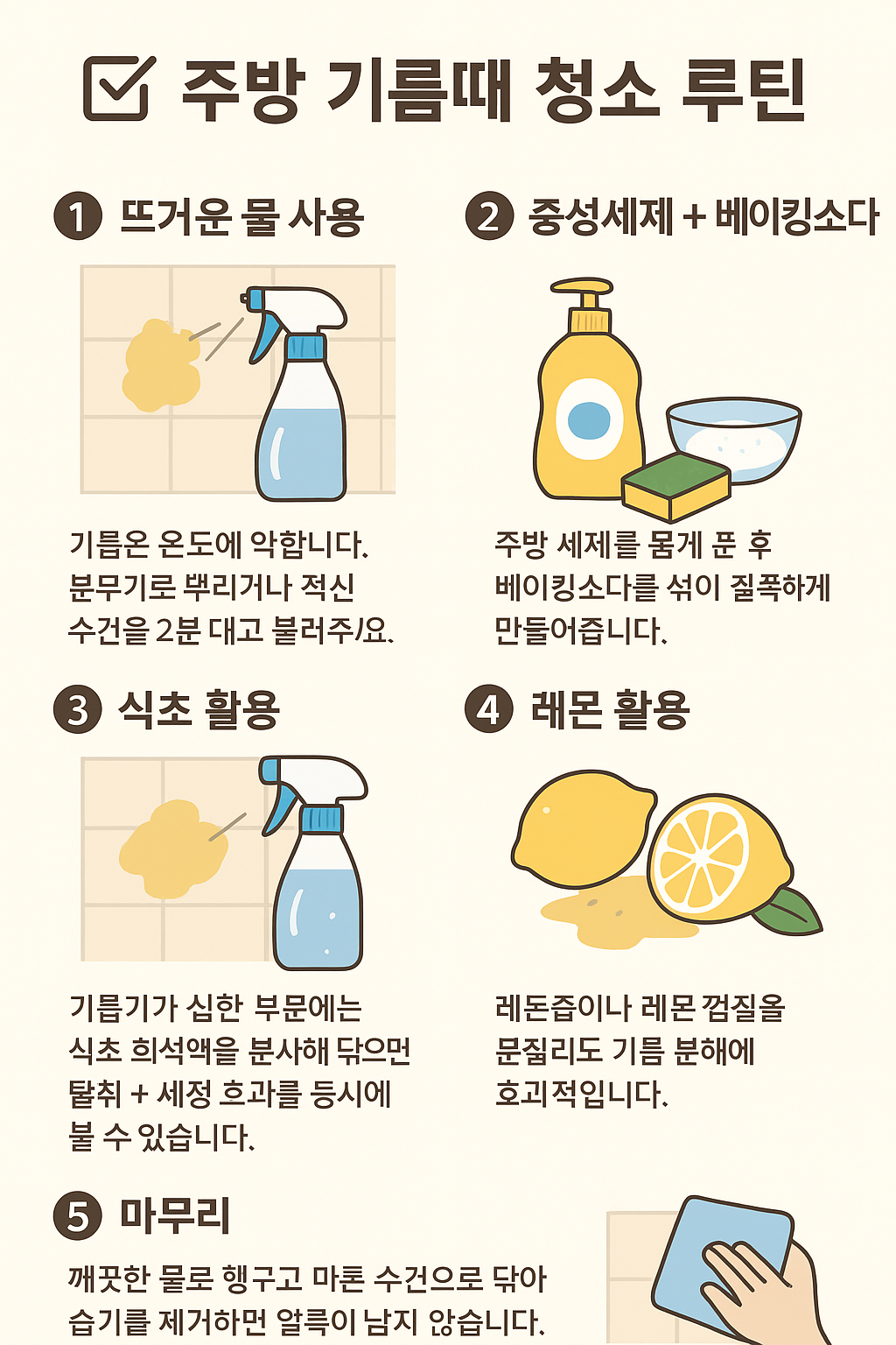 청소는 한 번에 힘들게 몰아서 하는 것보다, 작은 습관으로 예방하는 것이 훨씬 효율적입니다. 주방 기름때 역시 **‘예방 청소’**를 실천하면 쌓이는 것을 크게 줄일 수 있습니다.